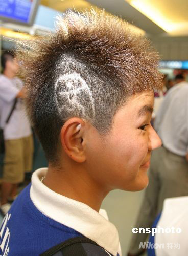 8月7日,參加北京奧運(yùn)的中華臺(tái)北代表隊(duì)女壘隊(duì)啟程,擔(dān)任女壘隊(duì)第一棒和守左外野的賴孟婷在發(fā)型上作了特殊造型,剃出“中國(guó)印”。 中新社發(fā) CNAsports 攝