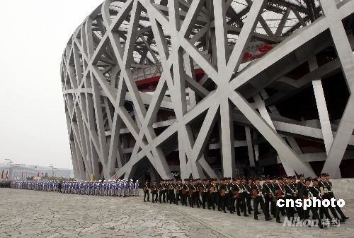8月8日,第29屆夏季奧運(yùn)會(huì)將于當(dāng)晚在北京奧林匹克公園內(nèi)的國家體育場開幕,武警進(jìn)駐“鳥巢”周邊警戒崗位。中新社發(fā) 杜洋 攝