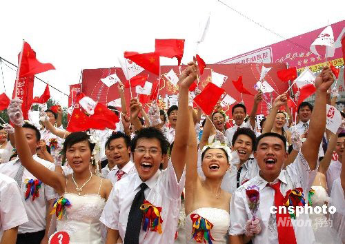 2008年8月8日,山東濱州50對新人齊聚廣場,手舉奧運旗幟高呼“中國加油、奧運加油”,與祖國同慶,與奧運同慶。中新社發(fā) 梁寶海 攝