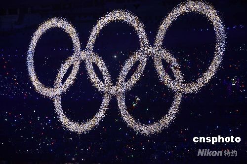8月8日晚8時(shí)8分,第二十九屆夏季奧運(yùn)會(huì)在北京的國(guó)家體育場(chǎng)--鳥(niǎo)巢隆重開(kāi)幕。五環(huán)圖案在北京“鳥(niǎo)巢”內(nèi)閃耀。中新社發(fā) 任晨鳴 攝