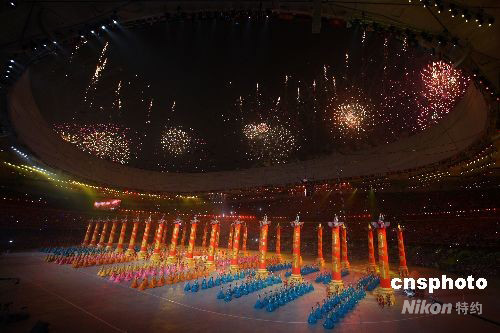 第二十九屆夏季奧運(yùn)會(huì)8月8日晚在北京奧林匹克公園內(nèi)的國(guó)家體育場(chǎng)舉行開幕式,禮花與中國(guó)禮樂表演構(gòu)成恢弘場(chǎng)面。中新社發(fā) 任晨鳴 攝