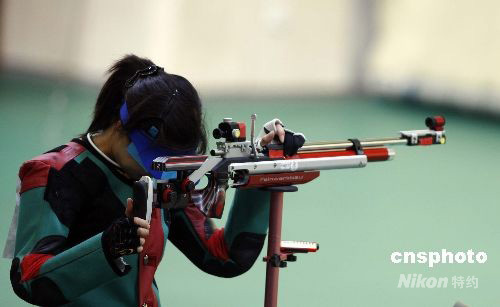 8月9日,北京奧運會開賽的第一天,女子10米氣步槍決賽在北京射擊館進行。中國選手杜麗無緣金牌,捷克選手卡特日娜·埃蒙斯獲得首枚金牌,同時也是北京奧運會產生的首枚金牌。中新社發(fā) 盛佳鵬 攝