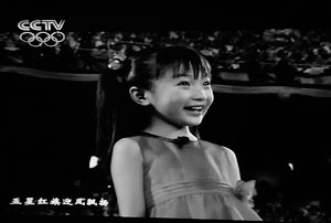 “五星紅旗迎風(fēng)飄揚(yáng),勝利歌聲多么響亮……”清澈的童音響徹“鳥巢”上空,昨晚8時6分,北京奧運(yùn)會開幕式升旗儀式前,一名身著紅色紗裙的女孩出現(xiàn)在電視畫面中,她緊攥拳頭,領(lǐng)唱《歌唱祖國》,隨后,代表56個民族的少年起舞、五星紅旗升起。