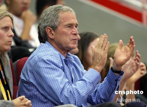 8月9日晚,雅典奧運(yùn)會(huì)冠軍美國(guó)女籃在北京奧運(yùn)會(huì)籃球館——五棵松體育館開(kāi)始衛(wèi)冕之旅。美國(guó)總統(tǒng)布什一家悄悄來(lái)臨,坐在奧林匹克大家庭普通看臺(tái)上觀看比賽,為美國(guó)女籃加油。 中新社發(fā) 任晨鳴 攝