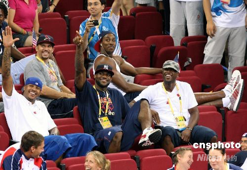 8月9日,美國(guó)總統(tǒng)布什一家來(lái)到五棵松體育館為美國(guó)女籃助威。同時(shí)前來(lái)為助威的美國(guó)男籃“夢(mèng)八隊(duì)”的超級(jí)球星:詹姆斯、韋德、霍華德、安東尼等,向布什總統(tǒng)致敬。 中新社發(fā) 任晨鳴 攝
