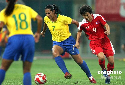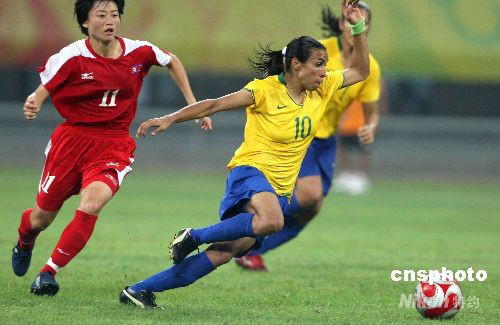 8月9日,北京奧運(yùn)會(huì)沈陽分賽場(chǎng)舉行女足預(yù)賽,巴西隊(duì)最終以2:1勝朝鮮隊(duì)。巴西球星瑪塔打入第二粒進(jìn)球。 中新社發(fā) 張宇 攝
