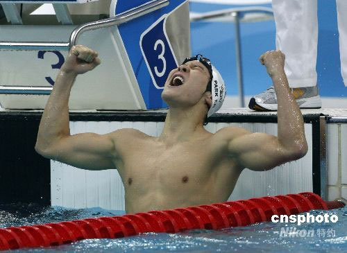 8月10日,韓國(guó)選手樸泰桓獲得北京奧運(yùn)會(huì)男子400米自由泳冠軍。中新社發(fā) 杜洋 攝