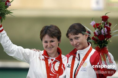 8月10日,北京奧運會女子10米氣手槍決賽在北京射擊館落下帷幕,中國選手郭文珺以492.3環(huán)勇奪金牌,俄羅斯選手納塔利婭·帕杰林娜總分489.1環(huán)位列第二獲得銀牌,格魯吉亞老將妮諾·薩盧克瓦澤以487.4環(huán)的成績奪得銅牌。 圖為帕杰林娜(左)與薩盧克瓦澤在領獎臺上親密合影。 中新社發(fā) 盛佳鵬 攝