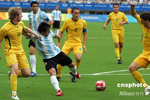 8月10日,北京奧運(yùn)會(huì)上海足球分賽場(chǎng)男足小組賽A組第二輪,阿根廷VS澳大利亞的比賽在上海體育場(chǎng)進(jìn)行,最終,阿根廷隊(duì)以1:0戰(zhàn)勝澳大利亞迎來(lái)二連勝,率先從小組出線。 中新社發(fā) 湯彥俊 攝