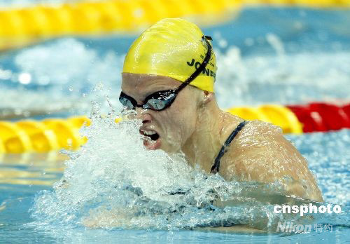 8月10日,澳大利亞著名選手瓊斯在女子100米蛙泳預(yù)賽中以1分05秒64的成績(jī),打破了由羅雪娟創(chuàng)造的1分06秒64的奧運(yùn)會(huì)紀(jì)錄。 中新社發(fā) 杜洋 攝