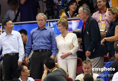 8月10日晚,北京奧運(yùn)會(huì)男子籃球中國(guó)隊(duì)與美國(guó)“夢(mèng)八隊(duì)”之戰(zhàn)在五棵松籃球館舉行,美國(guó)總統(tǒng)布什夫婦、老布什夫婦在中國(guó)外長(zhǎng)楊潔篪陪同下與爆滿的觀眾共同觀看比賽。 中新社記者 宋方燦攝