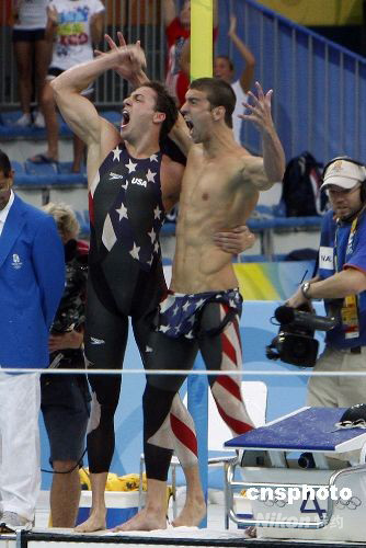 8月11日,美國隊奪得北京奧運(yùn)會男子4x100米自由泳接力險勝法國,奪得該項目的金牌,并打破世界紀(jì)錄。 中新社發(fā) 杜洋 攝