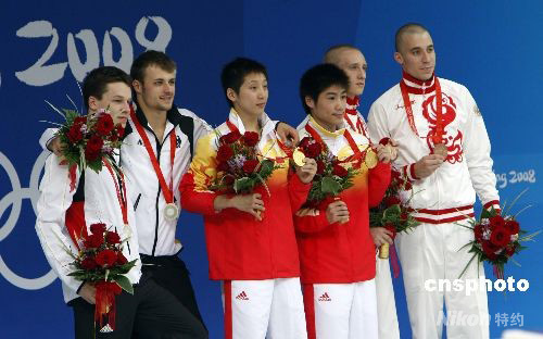 8月11日,中國“月亮組合”林躍(右)、火亮首次亮相奧運(yùn)大賽,獲得北京奧運(yùn)會(huì)男子10米雙人跳臺跳水金牌。這是當(dāng)天中國代表團(tuán)獲得的首枚金牌,也是中國代表團(tuán)在本屆奧運(yùn)會(huì)上獲得的第七枚金牌。林躍1991年出生,籍貫廣州潮州;鹆脸錾1989年,來自上海跳水隊(duì)。 中新社發(fā) 杜洋 攝