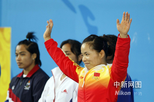 8月11日,北京奧運會開賽以來的第三天,女子舉重58公斤級的決賽在北京航空航天大學體育館拉開戰(zhàn)幕。雅典奧運會冠軍中國選手陳艷青獲得北京奧運會舉重女子58公斤級金牌,成功衛(wèi)冕,為中國代表團贏得第八枚金牌。中新社記者 盛佳鵬 攝