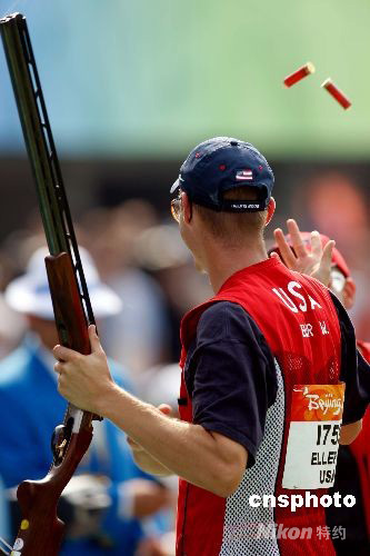 8月12日,北京奧運(yùn)會(huì)男子飛碟雙多向決賽在北京射擊館進(jìn)行,美國(guó)選手格倫·埃勒以190中獲得金牌。 中新社發(fā) 盛佳鵬 攝