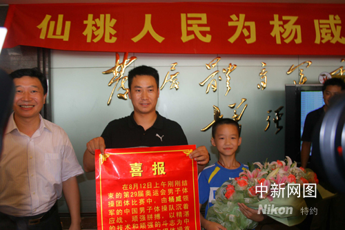 8月12日,楊威率領(lǐng)中國體操男隊(duì)奪得奧運(yùn)會團(tuán)體金牌。當(dāng)日中午時(shí)分,當(dāng)消息傳到楊威家鄉(xiāng)中國體操之鄉(xiāng)湖北仙桃市,早早守侯在電視機(jī)前的當(dāng)?shù)毓賳T、民眾一片沸騰,人們敲鑼打鼓、齊鳴鞭炮,熱烈慶賀仙桃籍運(yùn)動員楊威再次獲得奧運(yùn)會體操男團(tuán)冠軍。