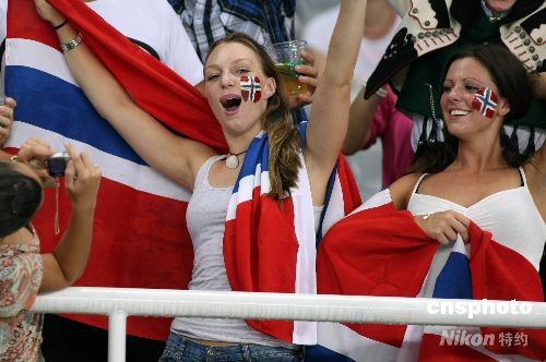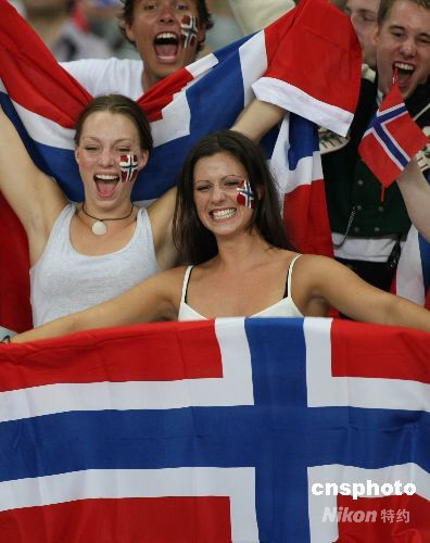 8月12日,兩位挪威美女專程趕來上海觀看奧運賽事,為挪威女足加油助威。當日,北京奧運會女足小組賽,挪威VS日本的比賽在上海體育場進行。 中新社發(fā) 湯彥俊 攝