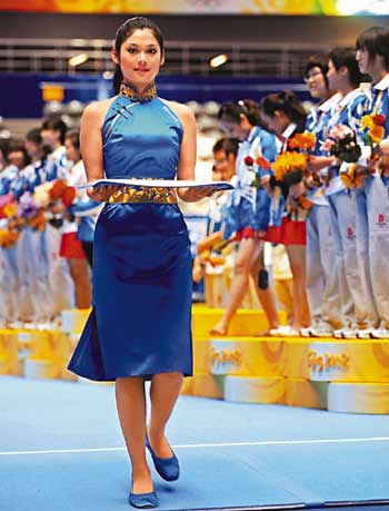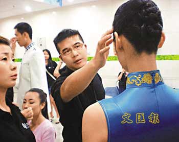中新網(wǎng)8月13日電 如同工筆畫般“雕琢”妝容、用接發(fā)或假發(fā)來統(tǒng)一發(fā)式發(fā)色、從眉毛的形狀到口紅的顏色都要與青花瓷、國槐綠的旗袍相融合……在已開啟大幕的奧運賽場,禮儀小姐們的妝容、發(fā)型成為中國式的美麗符號,運動員在開幕式或領獎臺上,向世界展示出了“中國形象”。在北京奧運會“美麗門面”的背后,有300多名化妝師承擔著所有場館、開閉幕式及奧運村內(nèi)1,000多名禮儀小姐的“梳妝打扮”,香港媒體為此專訪了奧運形象總設計師易茗,揭秘這出奧運會“美人計”。