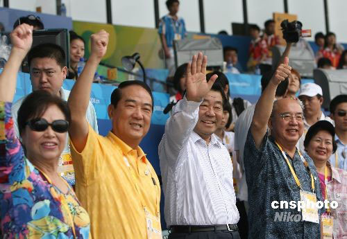 8月13日,北京奧運(yùn)會(huì)棒球比賽揭幕戰(zhàn)在中華臺(tái)北隊(duì)和荷蘭隊(duì)之間舉行,中共中央政治局常委、全國(guó)政協(xié)主席賈慶林與中國(guó)國(guó)民黨主席吳伯雄、親民黨主席宋楚瑜到現(xiàn)場(chǎng)觀戰(zhàn),共同為中華臺(tái)北棒球隊(duì)加油。中新社發(fā) 武仲林 攝
