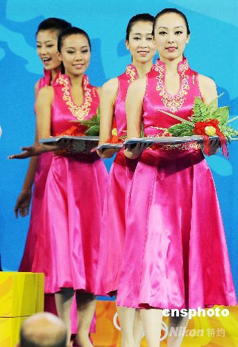 8月12日,北京奧運(yùn)頒獎(jiǎng)典禮由訓(xùn)練有素的禮儀小姐負(fù)責(zé)引導(dǎo)選手及傳遞獎(jiǎng)牌的工作,充分展現(xiàn)東方淑女的美麗風(fēng)采。 中新社發(fā) CNAsports 攝