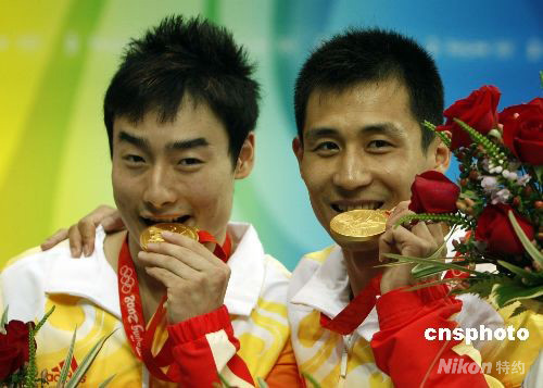 8月13日下午,北京奧運(yùn)會(huì)男子雙人三米板決賽在國(guó)家游泳中心進(jìn)行,最終中國(guó)選手王峰/秦凱以總分469.08分將這枚金牌收入囊中。這是中國(guó)跳水“夢(mèng)之隊(duì)”在北京奧運(yùn)會(huì)上獲得的第4枚金牌,也是中國(guó)代表團(tuán)在本屆奧運(yùn)會(huì)上獲得的第16金。俄羅斯“跳水沙皇”薩烏丁和搭檔庫(kù)納科夫以總分421.98分獲得亞軍,銅牌被烏克蘭選手克瓦沙/普雷格羅夫摘得,成績(jī)是415.05分。圖為獲獎(jiǎng)后的王峰、秦凱在笑品冠軍滋味。 中新社發(fā) 杜洋 攝