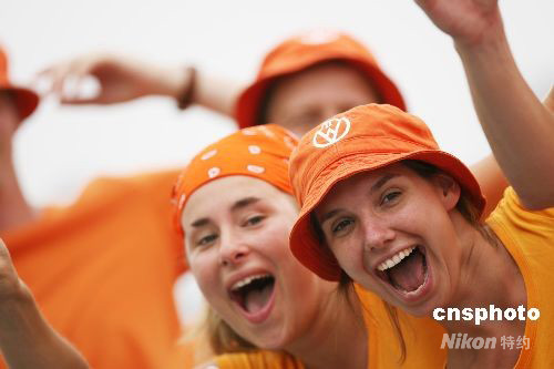 8月13日,北京奧運(yùn)會棒球比賽開賽,中華臺北隊(duì)在揭幕戰(zhàn)中以5:0完勝荷蘭隊(duì)。圖為激情荷蘭球迷現(xiàn)場助威。中新社發(fā) 武仲林 攝