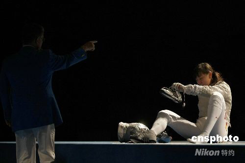 8月14日,北京奧運(yùn)會(huì)女子佩劍團(tuán)體決賽在國家會(huì)議中心擊劍館舉行。經(jīng)過三輪激戰(zhàn),中國隊(duì)以44 比45一分惜敗給黑馬烏克蘭隊(duì),遺憾地獲得銀牌。激烈比賽中倪紅的鞋子脫腳而出。 中新社發(fā) 盛佳鵬 攝