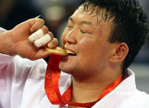 8月14日晚,蒙古男子柔道選手奈丹在北京奧運會男子柔道100公斤級決賽中獲得冠軍,這是蒙古國選手獲得的有史以來第一枚奧運會金牌。中新社發(fā) 任晨鳴 攝