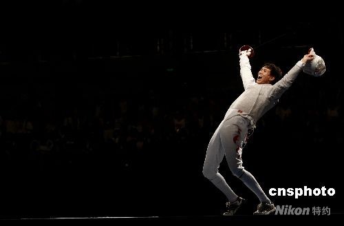 8月12日晚,08北京奧運(yùn)會男子佩劍個人賽決賽中,中國選手仲滿以15-9戰(zhàn)勝對手獲得冠軍,這是中國男子擊劍在奧運(yùn)會上第一次獲得冠軍。中新社發(fā) 盛佳鵬 攝