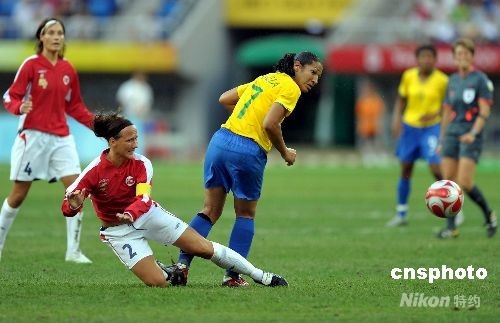 8月15日,奧運女足四分之一決賽在天津奧體中心水滴體育場舉行,由挪威女足對陣巴西隊,巴西上半時7號丹尼埃拉領(lǐng)先一球。中新社發(fā) 陳文 攝