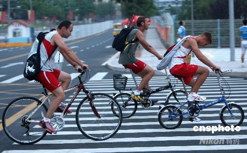 北京2008奧運(yùn)會(huì)青島分賽場(chǎng)的奧帆村居住著來自世界各地的400多名運(yùn)動(dòng)員,許多運(yùn)動(dòng)員在比賽之前選擇自行車運(yùn)動(dòng)為賽前的準(zhǔn)備活動(dòng),“自行車比賽”場(chǎng)景經(jīng)常可見。中新社發(fā) 趙振清 攝