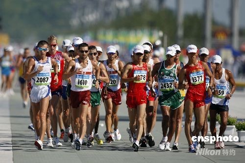 8月16日,北京奧運(yùn)會(huì)田徑比賽第二日,在北京國(guó)家體育場(chǎng)進(jìn)行的男子20公里競(jìng)走中,俄羅斯選手瓦列里-博爾欽以1時(shí)19分01獲得該項(xiàng)目金牌。 銀牌被厄瓜多爾選手赫費(fèi)爾松·佩雷斯以1小時(shí)19分15獲得,銅牌被澳大利亞選手賈里德·塔倫特以1小時(shí)19分42秒獲得。 中國(guó)三名選手王浩、禇亞飛與董吉敏無(wú)緣獎(jiǎng)牌。中新社發(fā) 盛佳鵬 攝
