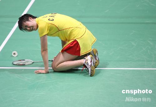 8月16日,中國選手盧蘭在北京奧運會羽毛球女單銅牌決賽中以1:2負于印尼選手瑪麗亞·克麗斯廷·尤利安蒂,無緣銅牌。 中新社發(fā) 武仲林 攝