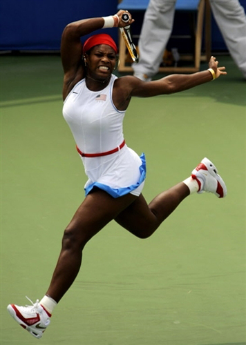 大威擊球的動作就像在“扭秧歌”,造型頗似奧運會徽“舞動的北京”。