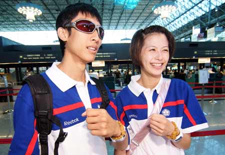中華臺北跆拳道奧運(yùn)選手朱木炎(左)、楊淑君是一對情侶,這對“神雕俠侶”再搭機(jī)前往北京參賽時(shí),兩人在機(jī)場都秀出日前求來的佛珠,希望一路平安、比賽順利。(下圖)