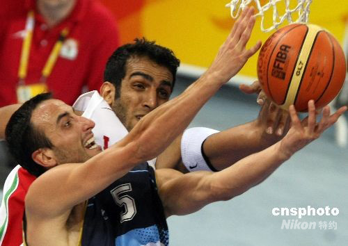 8月16日,北京奧運(yùn)會(huì)男子籃球小組賽第四輪比賽在五棵松籃球館舉行,雅典奧運(yùn)會(huì)冠軍阿根廷隊(duì)以97比82擊敗亞洲亞軍伊朗隊(duì),隊(duì)中“老大”、效力于NBA馬刺隊(duì)的球星吉諾比利砍下全場(chǎng)最高的32分。中新社發(fā) 任晨鳴 攝