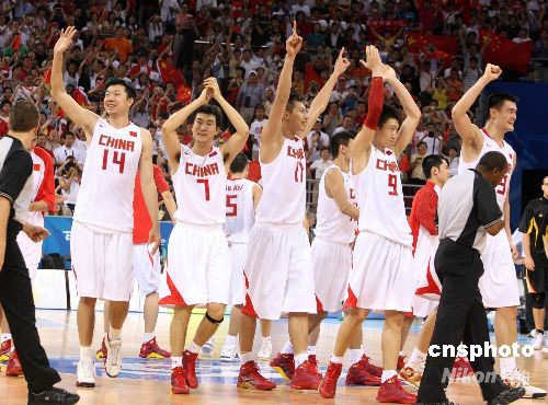 8月16日,北京奧運會男子籃球小組賽第四輪比賽在五棵松籃球館舉行。最終,中國隊以59比55艱難戰(zhàn)勝德國隊,提前鎖定奧運會8強席位。其中,姚明獲得全場最高的25分。中新社發(fā) 任晨鳴 攝