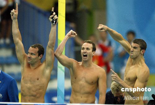 8月17日,美國隊獲得北京奧運會男子4乘100米混合泳接力冠軍,至此,23歲的美國游泳運動員菲爾普斯不僅用8金刷新了單屆奧運會金牌紀錄,而且還將個人所有奧運會的金牌總數提高到了14枚,達成了他人難以超越的“世界紀錄”。 中新社發(fā) 杜洋 攝