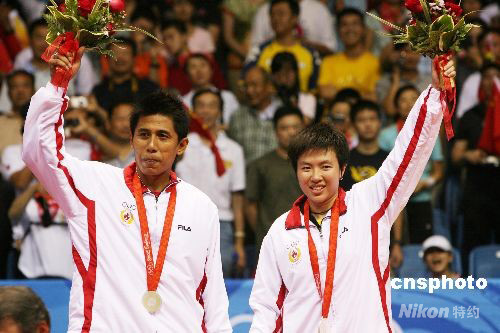 印尼選手利利亞納、諾瓦·維迪安托在北京奧運(yùn)會羽毛球混合雙打比賽中不敵韓國選手,奪得銀牌。