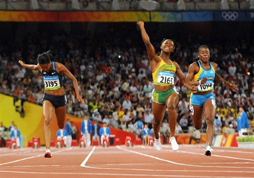 十七日晚,牙買加人干得更漂亮,三個(gè)牙買加姑娘依次沖過終點(diǎn)線,北京奧運(yùn)會(huì)女子一百米跑的獎(jiǎng)牌統(tǒng)統(tǒng)讓牙買加給包攬了。前一晚“鳥巢”的主角是牙買加漢子博爾特,這一晚的主角是三個(gè)牙買加姑娘。