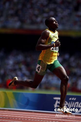 8月18日,北京奧運會男子200米預(yù)賽在北京國家體育場“鳥巢”舉行,剛拿到奧運百米冠軍的牙買加選手博爾特輕松晉級下一輪比賽。 中新社發(fā) 盛佳鵬 攝