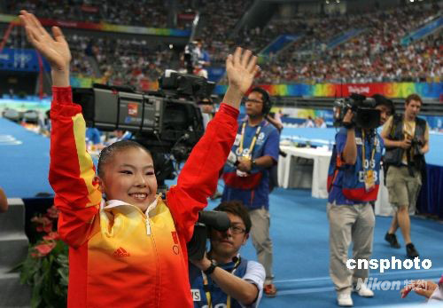 8月18日,中國選手何可欣在北京奧運(yùn)會(huì)女子高低杠決賽中表現(xiàn)出色,奪得金牌。 中新社發(fā) 武仲林 攝