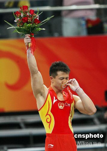 8月18日,中國選手陳一冰(右)在北京奧運會男子吊環(huán)決賽中以16.6分的成績奪得金牌,另一位中國選手楊威獲得銀牌。 中新社發(fā) 武仲林 攝