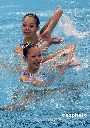 8月20日,北京奧運會花樣游泳雙人項目比賽全部結(jié)束,中國組合蔣婷婷/蔣文文的總成績?yōu)?6.334分,位列第四,創(chuàng)造了中國花樣游泳在奧運會上的最好成績。俄羅斯組合阿納斯塔西婭·達維多娃/阿納斯塔西婭·葉爾馬科娃以總分99.251分奪金。西班牙組合安德魯·富恩特斯/赫瑪·門瓜爾以總分98.334分獲銀牌。日本組合原田早穗/鈴木繪美子總分為97.167分獲銅牌。中新社發(fā) 杜洋 攝