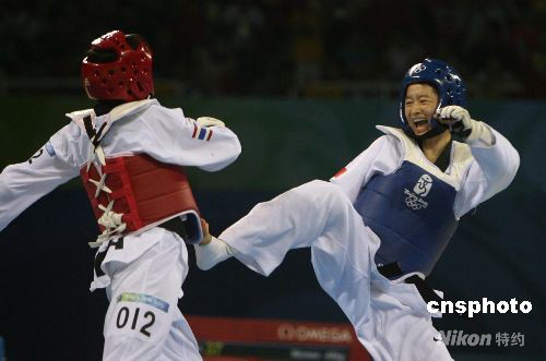 8月20日,中國(guó)選手吳靜鈺在北京奧運(yùn)會(huì)跆拳道女子49公斤以下級(jí)決賽中戰(zhàn)勝泰國(guó)選手布特雷·貝德蓬,奪得冠軍。中新社記者 武仲林 攝