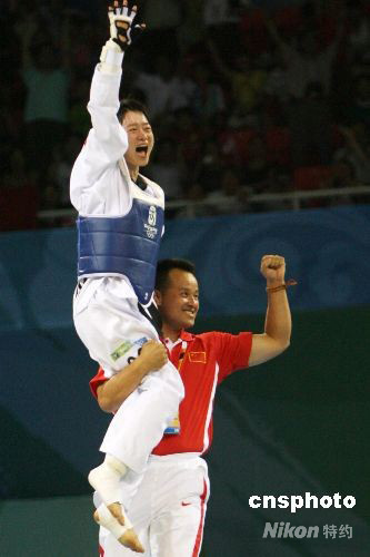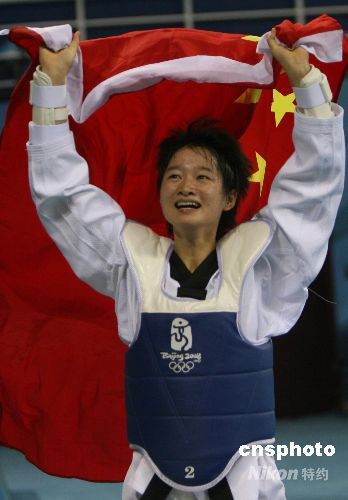 8月20日晚,21歲的中國(guó)姑娘吳靜鈺(左)在北京奧運(yùn)會(huì)跆拳道女子49公斤以下級(jí)冠亞軍決戰(zhàn)中,以1:-1戰(zhàn)勝泰國(guó)選手布特蕾·貝德蓬勇奪金牌,成為中國(guó)跆拳道在本屆奧運(yùn)會(huì)上奪得的第一枚金牌,中國(guó)體育代表團(tuán)金牌總數(shù)達(dá)到45枚。 中新社發(fā) 武仲林 攝
