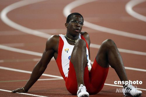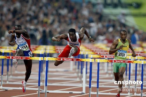 8月20日晚,在國(guó)家體育場(chǎng)鳥巢進(jìn)行的北京奧運(yùn)會(huì)男子110米欄半決賽中,世界紀(jì)錄保持者古巴選手羅伯斯(中)在第一小組比賽中以13秒12獲得第一,順利晉級(jí)決賽。中國(guó)選手史冬鵬僅跑出13秒42,位列小組第五,無緣決賽。中新社發(fā) 盛佳鵬 攝