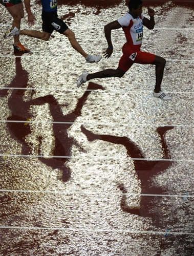 8月21號(hào)上午,在國(guó)家體育場(chǎng)“鳥(niǎo)巢”進(jìn)行的北京奧運(yùn)會(huì)田徑比賽迎來(lái)大雨,運(yùn)動(dòng)員們?cè)谟曛懈?jìng)技。