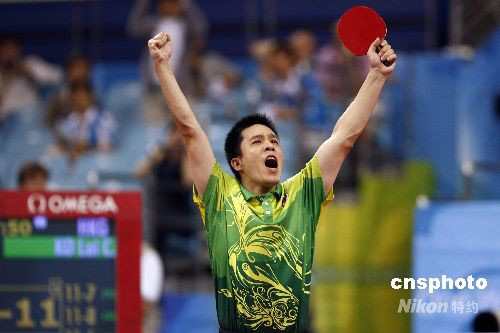 8月21日,北京奧運會乒乓球男子單打第三輪的比賽在北京大學體育館進行,中國香港選手高禮澤4比2戰(zhàn)勝韓國名將柳承敏晉級下一輪比賽。中新社發(fā) 盛佳鵬 攝
