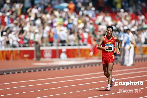 8月22日上午,北京奧運(yùn)男子50公里競(jìng)走比賽中,意大利選手亞歷克斯-施瓦策以3小時(shí)37分09秒奪得冠軍。中國(guó)選手李建波雖奮力追趕,但還是無(wú)緣獎(jiǎng)牌。 中新社發(fā) 盛佳鵬 攝